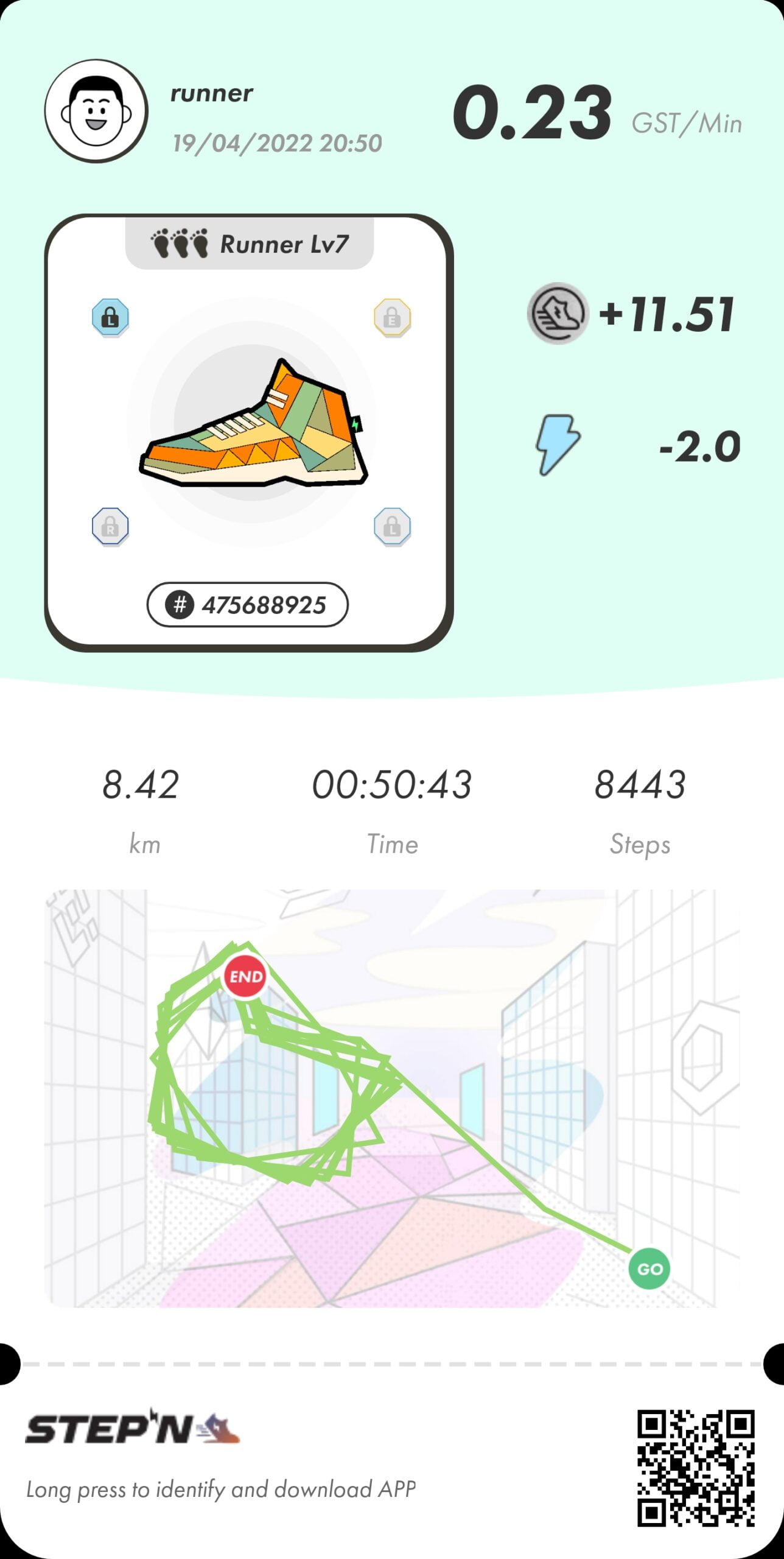 Runner LV7 Energy 2.0 Time 10m Earn 11.51GST(6,540円) Repair 2.28GST Level Up 8GST