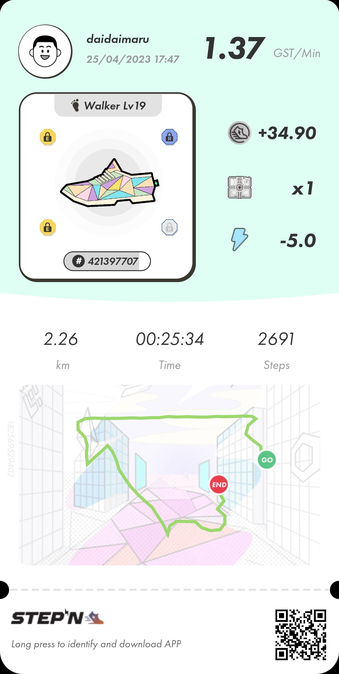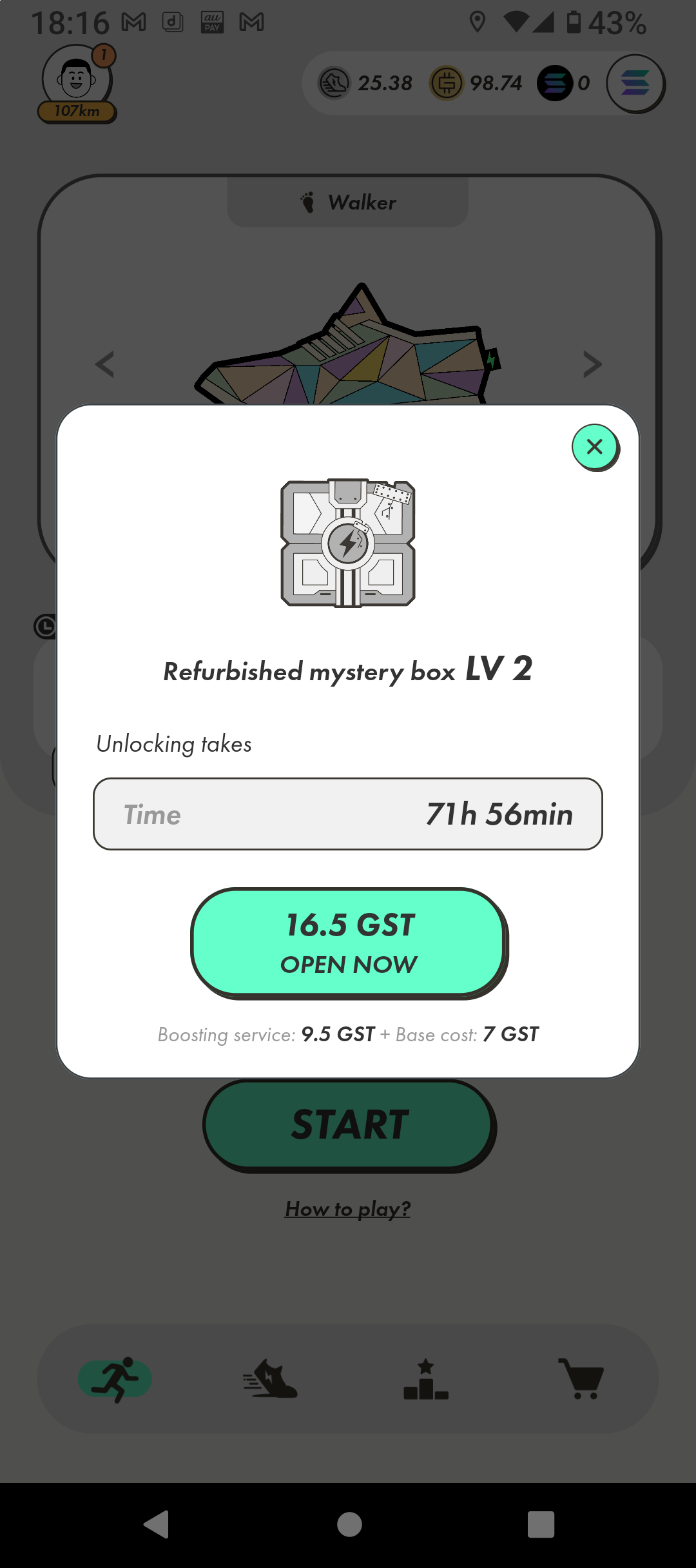 日常にちょこっとだけカラダにいいことをchocozap ステップン(STEPN)歩いて稼ぐ3足体制エナジー5歩いてみた WALK 歩いて稼ぐ2023.04.252023.04.26WALK 歩いて稼ぐ [広告] 当サイトはアフィリエイト広告を利用しています。ステップン(STEPN)歩いて稼ぐ3足体制エナジー5歩いてみた稼ぎ34.90GST 修理6.00GST レベル上げコモン3GSTと4GSTアンコモン7GST差引20GST(約50円)の稼ぎミステリーボックスレベル2ゲット ミントしてあわよくばアンコモンのスニーカーを出してやろうなんて考えていたけど一日50円位の稼ぎじゃミント代が貯まらない現金投資しないとダメだと気付いたミステリーボックスの開封状況も見て判断することにした