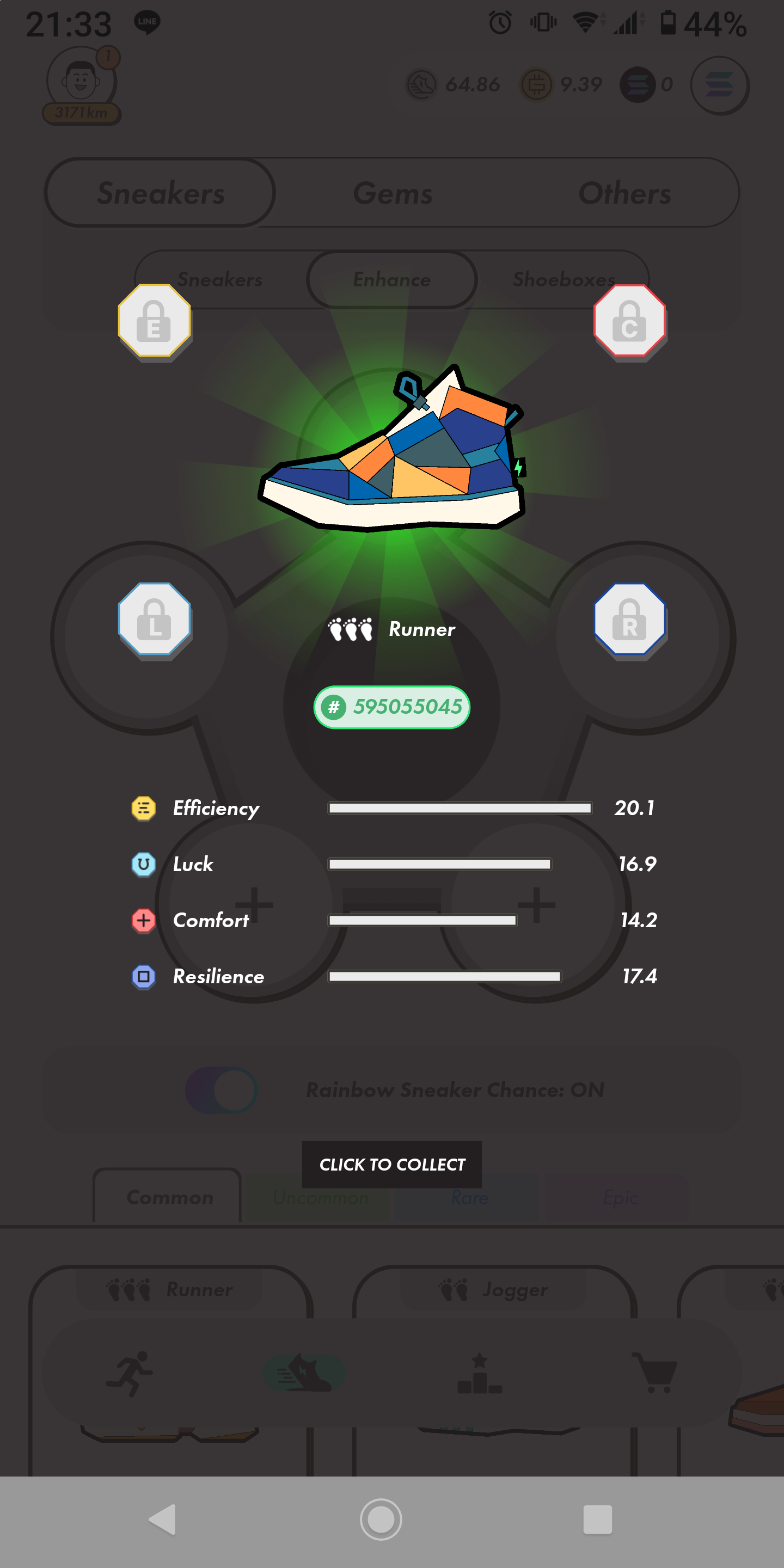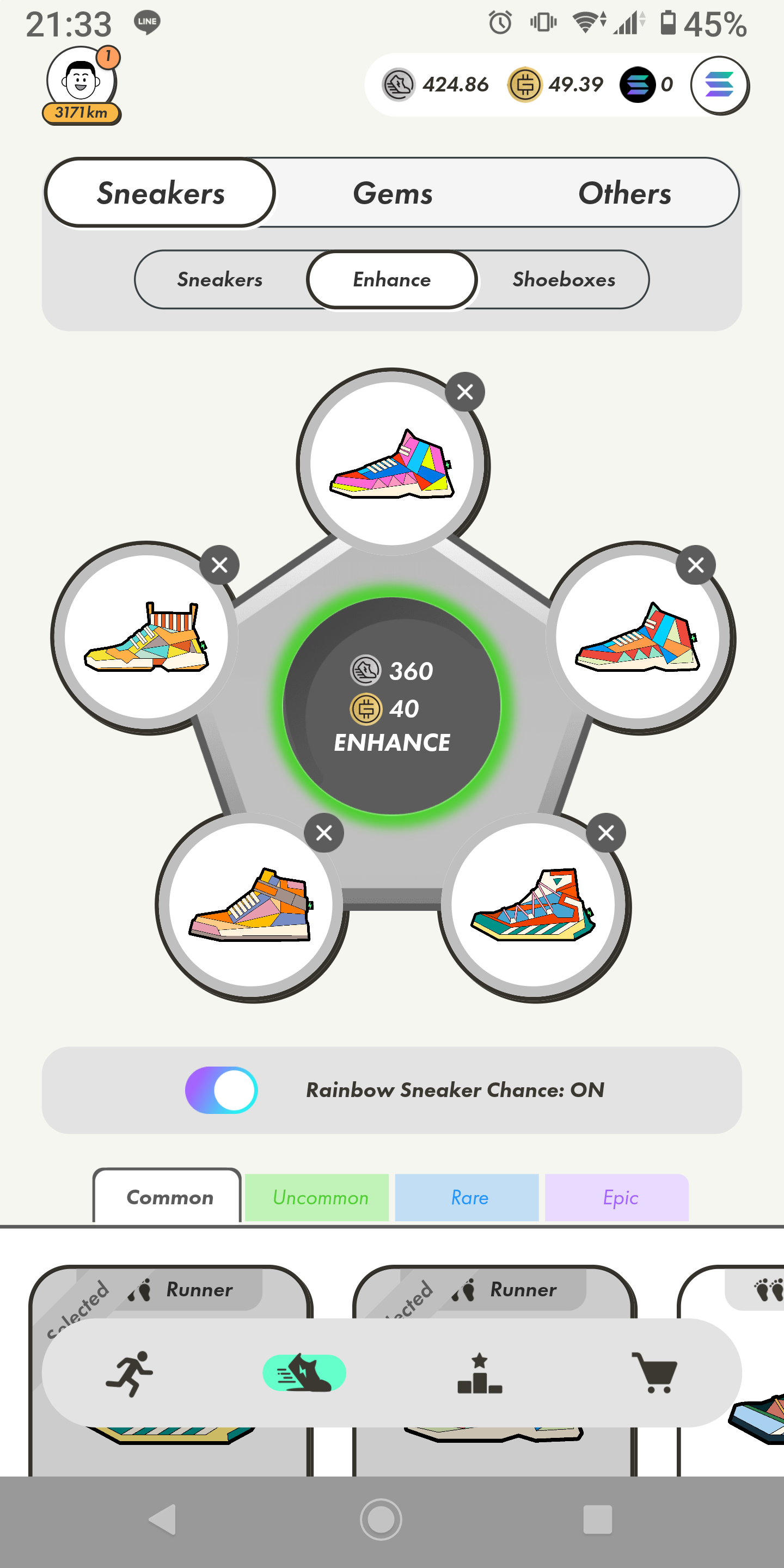 レアシューズの材料にするアンコモンを作るためのエンハンス実施。これでアンコモン5足。使用中の2足と材料の3足。アンコモンの材料のコモンは7足持っているので、コモンをあと3足買えば、あとはエンハンスをするだけですが、エナジーを減らさずにと考えると、ミントを数回するかもしれません。そういえばミントは1回しかやってないんですよね。
