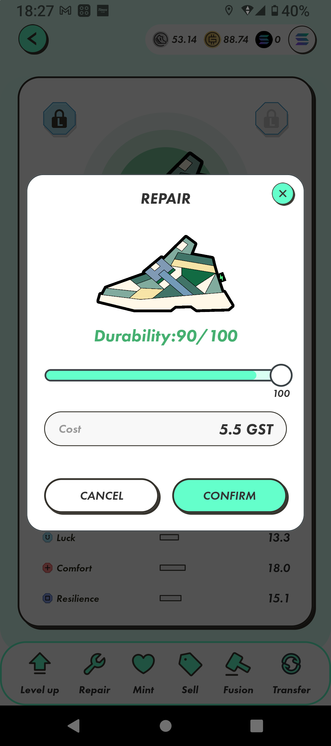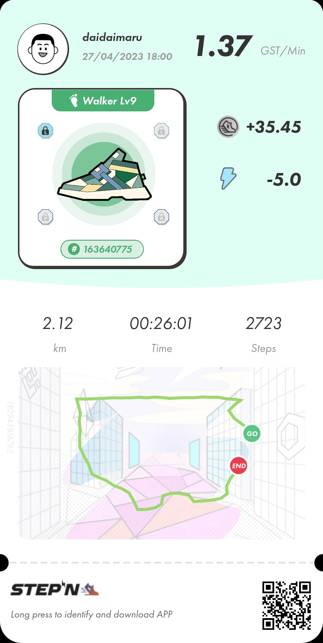 今日の稼ぎ 35.45GST 靴のリペア費用 5.5GST レベル上げ費用 なし 収支 29.95GST ミステリーボックス なし