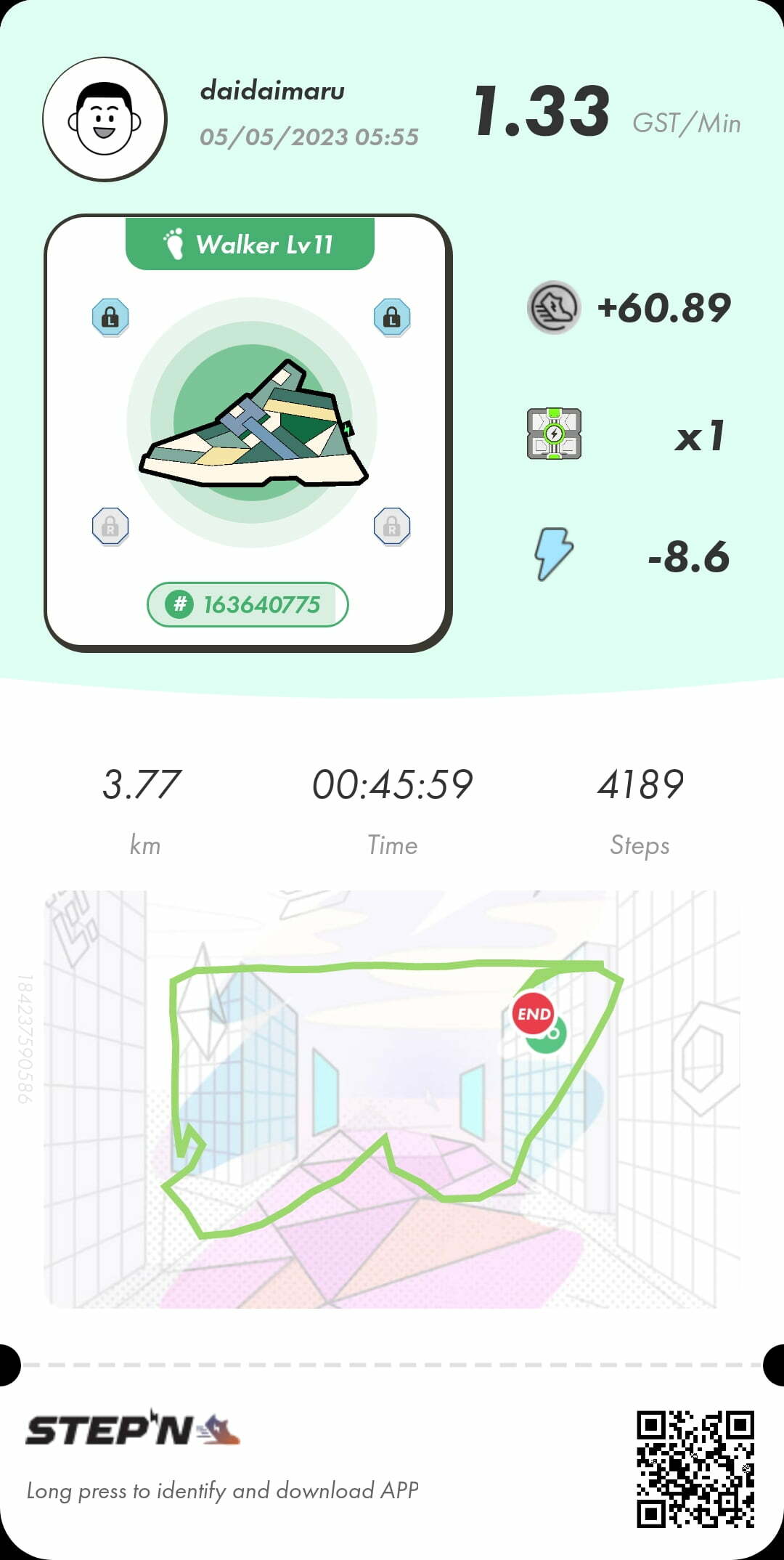 日常にちょこっとだけカラダにいいことをchocozap ステップン(STEPN)歩いて稼ぐ 9足体制 MB(MysteryBox) ミステリーボックス2023.05.052023.05.06MB(MysteryBox) ミステリーボックスWALK 歩いて稼ぐ [広告] 当サイトはアフィリエイト広告を利用しています。ステップン(STEPN)歩いて稼ぐ 9足体制5月6日(金) 9足体制にしてから二日目ミステリーボックスLevel4狙いですLuck値が低いので 当然といえば当然でLevel3でした稼ぎ 60.89GST 靴修繕費 -10.2GST ミステリーボックス開封 なし靴レベル上げ アンコモン-12GST アンコモン-6GST収支 32.69GST(¥77.31)¥2.365/GST ¥42.25/GMTで計算しました