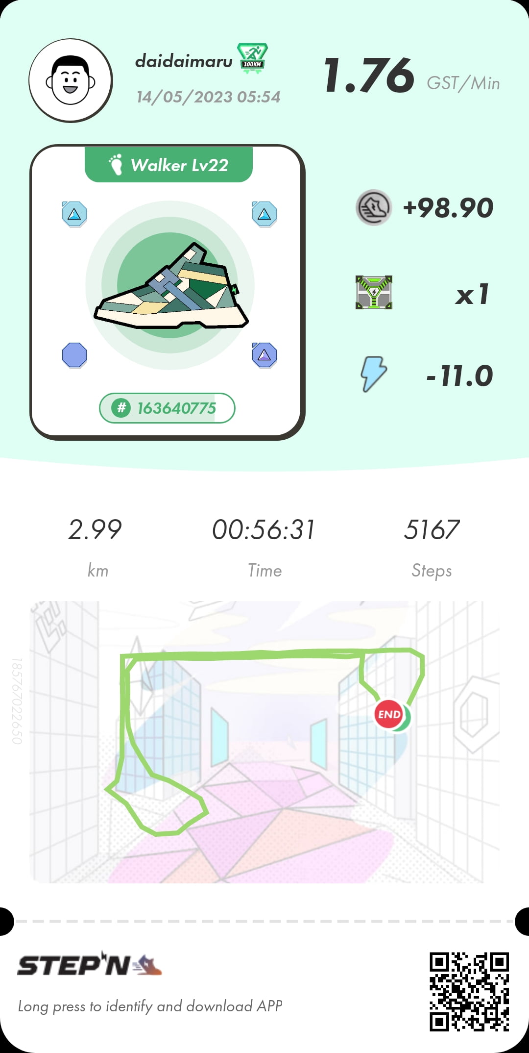 ステップン(STEPN)歩いて稼ぐ レベル上げに専念中5月14日