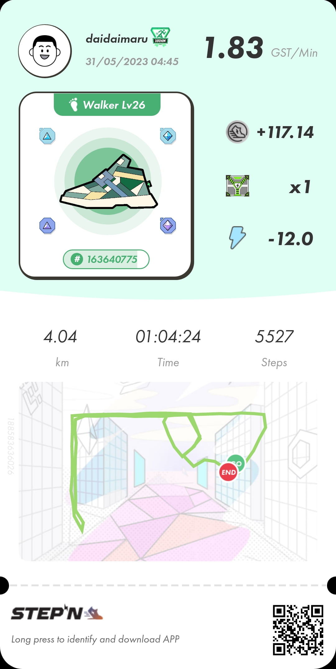 STEPN(ステップン)歩いて稼ぐ 続く出費に不安が募る5月21日スニーカーのレベルアップMB(MysteryBox)の開封バリチャレとにかく出費が続く歩き担当本日の稼ぎ +116.17GST靴修繕費 -18GSTレベルアップ費 -26GST -10GMT一気にレベル上げていますMB(MysteryBox) -54.74GST  ソケット解除 なしバリチャレ -50GST当然失敗収支 -32.57GST -10GMT(-455.37円)投稿時または更新時のCoinMarketCapの価格を参照しています